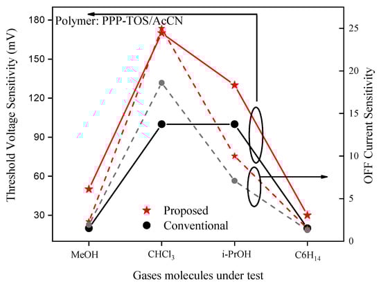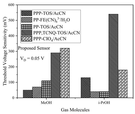 Threshold voltage sensitivity measurements for the proposed gas sensor with MeOH and i-PrOH using polymers, PPP-TOS/AcCN, PP-Fe(CN)63−/H2O, PP-TOS/AcCN, and PPP-CIO4/AcCN, as demonstrated in Figure 10, reveal high sensitivity and selectivity across the board. Among these, PPP-TCNQ-TOS/AcCN exhibits outstanding selectivity for i-PrOH, making it the optimal choice for this target, while PP-TOS/AcCN and PPP-CIO4/AcCN prove most effective for MeOH detection. These outcomes facilitate targeted polymer selection for maximizing sensitivity in specific gas detection applications.