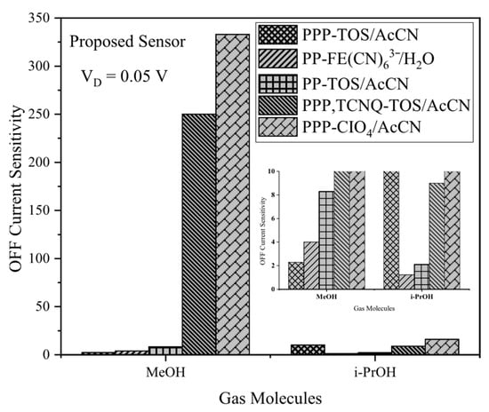 Analysis of OFF current sensitivity for MeOH and i-PrOH using the same polymer set visualized in Figure 11 shows that PPP-CIO4/AcCN and PPP-TCNQ-TOS/AcCN deliver strong, acceptable sensitivity for MeOH, but substantially lower values for i-PrOH, highlighting pronounced selectivity. The enlarged inset highlights the disparity, emphasizing that while threshold voltage sensitivity provides robust detection for both gases, OFF current sensitivity can be extremely specific, making it particularly effective for distinguishing methanol (MeOH) using these polymers. This leads to even greater selectivity than that achieved by threshold voltage sensitivity alone.