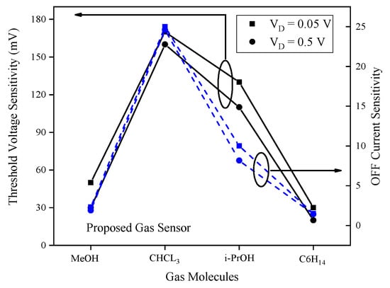 The analysis of sensitivity metrics—threshold voltage and OFF current sensitivities—across MeOH, CHCl3, i-PrOH, and C6H14 at Vds = 0.05 V in both conventional and proposed sensors underscores complementary performance, as illustrated in Figure 9. Both metrics follow a similar trend, peaking at CHCl3 and declining thereafter, though threshold voltage sensitivity consistently surpasses OFF current sensitivity in magnitude for both devices. Selectivity, as indicated by the derivative of sensitivity with respect to gas type, is higher when OFF current sensitivity is used as the metric, particularly in cases where analytes more strongly affect the OFF current. However, the conventional sensor shows reduced selectivity between chloroform (CHCl3) and isopropanol (i-PrOH), as the threshold voltage sensitivity for these gases converges. As a meaningful result, it is observed from the figure that the proposed gas sensor exhibits greater threshold voltage and OFF current sensitivities than the conventional sensor, indicating its promise as a highly sensitive gas detection platform. This dual-metric approach provides a more nuanced understanding of gas-sensing mechanisms, enhancing the applicability of the sensor to varied environments.