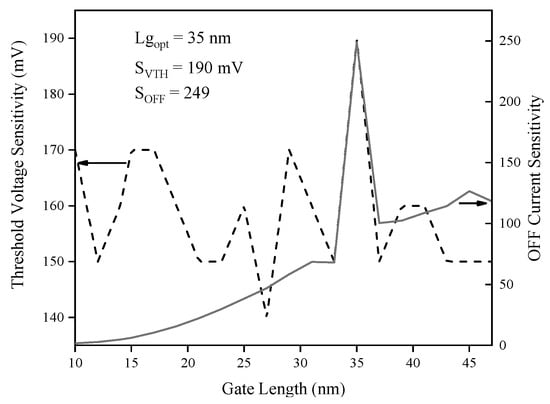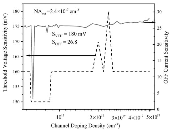 The optimal channel doping density of 2.4 × 1017 cm−3 is selected, as it maximizes threshold voltage sensitivity without sacrificing OFF current sensitivity, thereby securing high device responsiveness and minimizing the risk of excessive leakage or instability in operation that can be observed in realistic conditions.