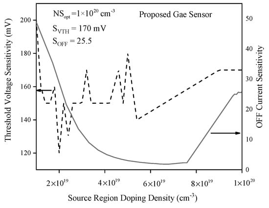 Figure 16 presents a “bowl-shaped” OFF current sensitivity profile, with a minimum at a source doping density of 6 × 1019 cm−3, and maximum sensitivities observed at lower source doping. However, low doping cannot be considered optimal because the sensing current becomes overly controlled by the drain voltage, potentially compromising performance. Threshold voltage sensitivity shows irregular fluctuations at lower doping, followed by a monotonic increase at higher doping concentrations; the highest observed value is 170 mV at the maximum doping density of 1 × 1020 cm−3, where OFF current sensitivity is 25.5. Therefore, the maximum tested source region doping density is chosen as optimal, providing strong sensitivity and robust sensor operation by minimizing drain-voltage-induced variability and optimizing the tunneling junction for reliable gas detection.