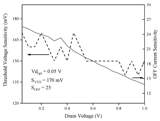 Threshold voltage and OFF current sensitivities versus drain voltage.