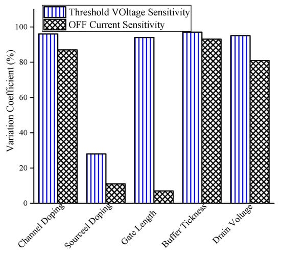 Figure 18 reveals that both sensitivities decline as drain voltage increases, with the highest values observed at a low drain voltage of 0.05 V, a condition crucial for achieving ultra-low-power sensor operation. At this voltage, threshold voltage sensitivity reaches 170 mV, while OFF current sensitivity is 25, indicating superior responsiveness in threshold-voltage-based detection. The low-voltage regime is therefore critical for maximizing sensitivity and minimizing power consumption, aligning with the energy-efficient design objectives of advanced gas sensor technologies. Figure 19 presents a statistical analysis using the coefficient of variation (CV) for threshold voltage sensitivity and OFF current sensitivity, plotted against channel doping, source doping, gate length, buffer thickness, and drain voltage. The CV is defined as follows in this work: