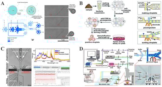 Isolation of a single bacterium based on the droplet sorting technique. (A) A microfluidic platform for size-based passive sorting of droplets exploiting interfacial tension reduction (reproduced with permission from [55], copyright 2024, Royal Society of Chemistry). (B) Schematic representation of the isolation of targeted single bacterial droplets using FADS (reproduced with permission from [56], copyright 2018, Royal Society of Chemistry). (C) High-throughput label-free identification of chemicals in droplets and on-demand collection through UVADS (reproduced with permission from [57], copyright 2021, American Chemical Society). (D) RADS platform for label-free high-throughput screening of unicellular microalgae (reproduced with permission from [58], copyright 2017, American Chemical Society).