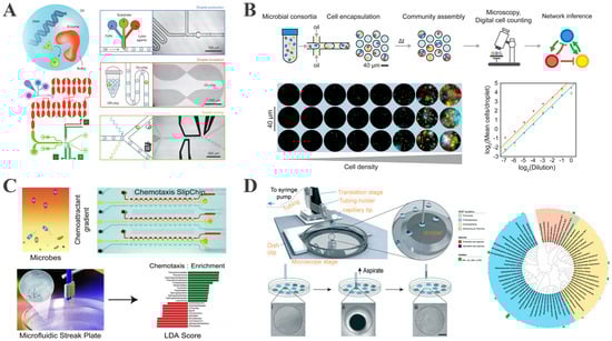 Droplet-based microfluidics for representative applications in single-bacterium analysis. (A) Microfluidic platform for the directed evolution of aldolases (reproduced with permission from [104], copyright 2016, Springer Nature). (B) Overview and characterization of microbial interaction network inference in a microdroplet (reproduced with permission from [105], copyright 2019, Elsevier). (C) Chemotactic screening of imidazolinone-degrading bacteria by microfluidic SlipChip (reproduced with permission from [106], copyright 2019, Elsevier). (D) Development of an improved high-throughput MSP platform to accelerate microbial isolation from deep sea sediments (reproduced with permission from [107], copyright 2020, Royal Society of Chemistry).