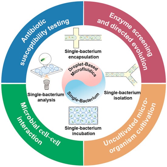 In this review, we focus on the core methods and applications of droplet-based microfluidics for the single-cell analysis of bacteria (Scheme 1). First, we introduce the fundamental principles and innovations across droplet-based microfluidic platforms for single-bacterium analysis, including encapsulation, isolation, culture, and monitoring. Subsequently, we highlight key application domains in single-bacterium research, featuring representative applications in antibiotic susceptibility testing (AST), enzyme-directed evolution, microbial interaction studies, and the isolation of uncultivated microorganisms.