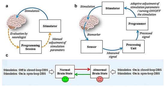 Paradigm shift in deep brain stimulation from open- to closed-loop systems. (a) Open-loop DBS provides continuous stimulation with fixed stimulation parameters. (b) Closed-loop DBS automatically adjusts based on real-time brain signal monitoring and feedback. (c) Comparison of system operation in normal and abnormal brain states; minimizing side effects by providing stimulation only if needed in closed-loop systems based on research by Parastarfeizabadi and Kouzani. Reproduced with permission from [40].