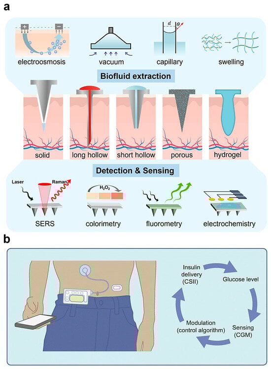 - Wang, Y.; Wu, Y.; Lei, Y. Microneedle-based glucose monitoring: A review from sampling methods to wearable biosensors. Biomater. Sci. 2023, 11, 5727–5757. [Google Scholar] [CrossRef]