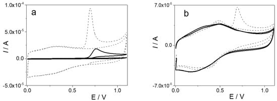 An Epsilon potentiostat (BASi-Bioanalytical System and run with the BAS Epsilon EC Windows software version 1.60.70) coupled to a PC with incorporated analyzer software was used to perform cyclic (CV) and differential pulse (DPV) voltammetries. A C3 electrochemical cell (BASi-Bioanalytical System) with a GCE (CH Instruments, 3 mm diameter), a platinum wire, and Ag/AgCl, 3 M KCl (BAS, RE-5B) were used as working, counter, and reference electrodes, respectively, for all experiments. CV measurements were performed by applying a scan rate (υ) of 0.1 V s−1 in the potential window range from 0.0 V to 1.1 V. The parameters used in DPV were a step (Estep) and amplitude (Epulse) of the pulse of 0.005 V and 0.050 V, respectively, and a pulse width (tpulse) of 40 ms, allowing υ = 0.010 V s−1. All DPV measurements were performed in the potential window from 0.0 V to 1.0 V.