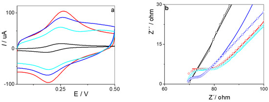 Electrochemical impedance spectroscopy (EIS) was carried out using a PalmSens4 Potentiostat coupled to a PC with PS Trace 5.11 Software (Palm Sens, Houten, The Netherlands). To perform EIS, a sinusoidal wave with an amplitude of 0.015 V was applied in the frequency range from 50 mHz to 0.5 MHz centered at the equilibrium potential of the system (at about 0.230 V), formed by a solution of 1 mM ferrocenemethanol + 0.1 M KCl.