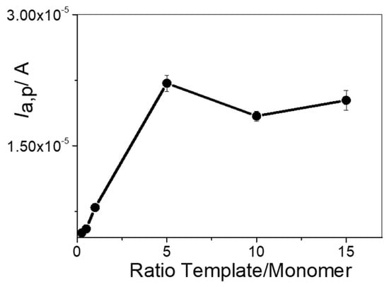 Ia,p values in 0.5 mM PAR + 0.1 M HClO4 obtained via DPV at different template to monomer ratios.
