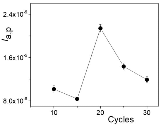 Ia,p values in 0.5 mM PAR + 0.1 M HClO4 obtained via DPV as a function of the number of polymerization cycles.
