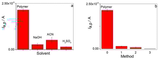 Another factor of great significance in the formation of the MIP/rGO/GCE is the removal of the analyte from the cavities formed in the electropolymerization stage. This process aims to extract unreacted monomer residues and release PAR from the cavities formed in the polymer without affecting their structure and functionality. As interactions between PAR and the MIP are dependent on pH and ionic strength, different media were studied to optimize the desorption of PAR. In the first step, the template removal procedure was performed for 30 min using three removal solutions, such as 1 M NaOH aqueous solution, ACN, and 0.5 M H2SO4 aqueous solution. The effectiveness of the different methods used to remove PAR was evaluated in terms of Ia,p (in the potential zone around 664 mV) after the removal step, compared to Ia,p obtained for the polymer generated with 0.5 mM PAR. The lower Ia,p value obtained after each method used allowed us to infer the more effective process for cleaning and removing PAR from the polymer. Figure 6a shows a diagram bar where the Ia,p values for PAR oxidation were compared for the three solutions. When the removal step was performed with 0.5 M H2SO4 aqueous solution, the Ia,p value decreased 93.5%, showing the best performance for removing PAR. These results were consistent with both the increased proton concentration and higher ionic strength of the removal solution. In order to improve this process, three different methods for the removal of the analyte from the polymer cavities using 0.5 M H2SO4 as the principal solvent were carried out. The first method consisted of immersing the electrode in 0.5 M H2SO4 for 30 min (method 1), and then performing cyclic voltammetry in 0.5 M H2SO4, as previously described. The second method consisted of immersing the electrode in H2O for 12 h and then performing 10 cycles in 0.5 M H2SO4 (method 2). The third method consisted of immersion of the electrode in H2O for 3 h, followed by 10 cycles in 0.5 M H2SO4, then immersion of the electrode in H2O for 30 min and, finally, 5 cycles in 0.5 M H2SO4 (method 3).