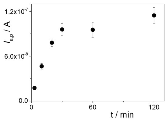 Ia,p values obtained via DPV as a function of rebinding time in 30 nM PAR + 0.1 M HClO4.