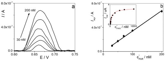 Once all parameters were optimized for PAR determination with the electrochemical sensor, a calibration curve was constructed using DPV for different concentrations of PAR in 0.1 M HClO4. Figure 8a shows the differential pulse voltammograms obtained for PAR concentrations lower than 200 nM. The calibration curve shown in Figure 8b exhibited a linear relationship between Ia,p and PAR concentration in the range from 30 to 200 nM, with a correlation coefficient (r2) of 0.9968. The analytical sensitivity was (3.4 ± 0.1) A M⁻¹, and the limit of detection (LOD), calculated as 3σ/S (where σ is the standard deviation of the blank and S is the sensitivity of the calibration curve), was 10 nM [53].
