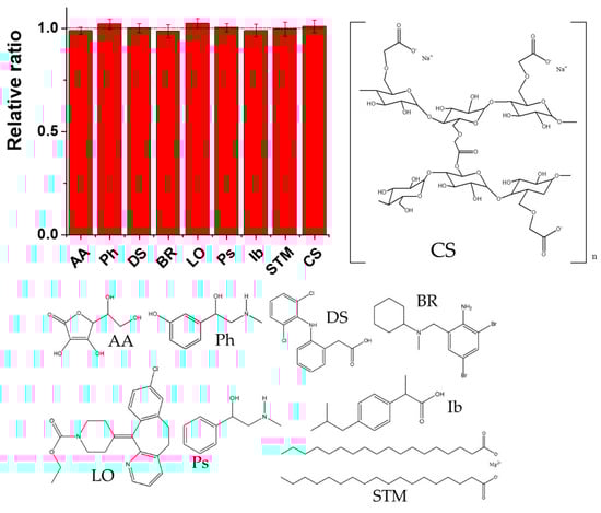 Additionally, the selectivity of the sensor for the quantitation of PAR was determined in the presence of possible interfering compounds, such as AA, phenylephrine (Ph), DS, bromhexine (BR), loratadine (LO), pseudoephedrine (Ps), Ib, stearate magnesium (STM), and croscarmellose sodium (CS), at 10-fold concentrations as compared to that of PAR (at a PAR concentration of 100 nM). As shown in Figure 9 the presence of these interfering compounds caused negligible changes in the response (less than 3%).