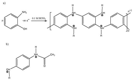 Molecular structures of (a) polymer obtained by electropolymerization of o-AP, and (b) PAR, both in 0.1 M of HClO4.