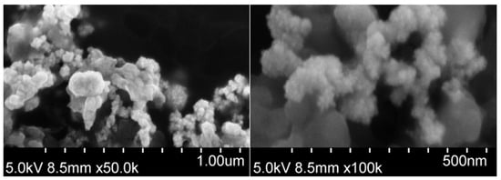 As it is known that the catalytic activity of nanozymes is affected by their size and morphology [21,22], PtCo nanoparticles were characterized by FE-SEM. Figure 2 shows FE-SEM images of PtCo nanoparticles at 50,000× and 100,000× magnification. Although the exact size of each individual nanoparticle cannot be determined from the provided images, it is evident that they are smaller than 50 nm and tend to assemble into larger, three-dimensional, coral-like aggregates. This particle size and morphology suggest a high specific surface area. Previous studies on nanozymes have demonstrated that nanoparticles with smaller dimensions and specific morphologies, which contribute to increased surface area, generally exhibit enhanced catalytic activity [23]. For instance, the PO-like catalytic activity of Fe3O4 nanoparticles has been shown to increase with decreasing particle size [24]. Similarly, CoFe2O4 nanoparticles exhibit size- and shape-dependent PO-like catalytic activity, following the following order: spherical > near corner-grown cubic > starlike > near cubic > polyhedral [25].