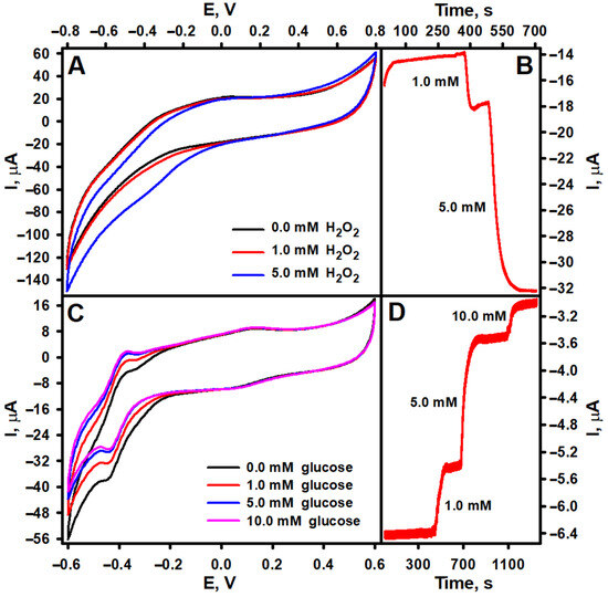 Cycling voltammograms and amperograms of GRE/PtCo/Nafion (A,B) and GRE/PtCo/GOx/Nafion (C,D) electrodes. GRE/PtCo/Nafion preparation conditions: 3 µL of 0.32 U mL−1 PtCo, 3 µL of Nafion™. GRE/PtCo/GOx/Nafion preparation conditions: 3 µL of 0.32 U mL−1 PtCo, 3 µL of 40.0 mg mL−1 GOx, 3 µL of Nafion™. Measurement conditions: AFBS (pH 6.0); −0.3 V applied potential vs. Ag/AgCl/KCl3M (B,D); 0.1 V s−1 scan rate (A,C).