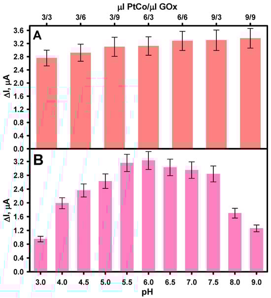 The pH of the buffer solution and the quantities of PtCo and GOx on the working electrode surface were experimentally optimized to achieve the best possible biosensor performance. According to the proposed simplified illustration of the operating principle of the developed amperometric enzyme–nanozyme biosensor, shown in Figure 1, its operation relies on glucose oxidation catalyzed by immobilized GOx in the presence of dissolved O2, alongside the PtCo nanoparticles’ ability to catalyze the reduction of enzymatically generated H2O2. Therefore, both PtCo and GOx can affect the magnitude of the current generated by the biosensor. Figure 4A shows the relationship between the biosensor’s response current and the loading amounts of PtCo and GOx at a fixed glucose concentration (2.0 mM). An enhancement in the response current was observed with increasing loadings of both enzyme and nanoparticles on the surface of the GRE electrode. This improvement with increasing GOx loading is attributed to the formation of a higher amount of H2O2, which in turn produces a higher electrochemical signal [35]. Similarly, higher PtCo loading likely contributes to improved catalytic reduction of H2O2 and an increased effective electrode surface area due to the nanoparticles’ high surface-area-to-volume ratio [36]. However, when the loading of both GOx and PtCo exceeded 6 µL, the response current increased only very slightly, indicating saturation of the catalytic sites or mass transfer limitations [37]. Consequently, these volumes (6 µL of 40.0 mg mL−1 GOx and 6 µL of 0.32 U mL−1 PtCo) were selected as optimal for loading both the enzyme and the nanozyme in subsequent experiments.