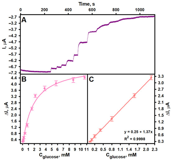 Dependence of the biosensor current response on glucose concentration (A,B) and calibration curve (C). GRE/PtCo/GOx/Nafion preparation conditions: 6 µL of 0.32 U mL−1 PtCo and 6 µL of 40.0 mg mL−1 GOx, 3 µL of Nafion™. Measurement conditions: AFBS (pH 6.0); −0.3 V applied potential vs. Ag/AgCl/KCl3M; 0.04, 0.10, 0.20, 0.40, 0.80, 1.59, 2.18, 3.78, 5.75, 8.70 and 10.66 mM of glucose.