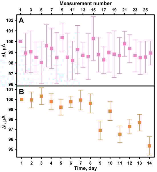Operational (A) and storage (B) stability of the biosensor. GRE/PtCo/GOx/Nafion preparation conditions: 6 µL of 0.32 U mL−1 PtCo, 6 µL of 40.0 mg mL−1 GOx, and 3 µL Nafion™. Measurement conditions: AFBS (pH 6.0); −0.3 V applied potential vs. Ag/AgCl/KCl3M; 2.0 mM of glucose.