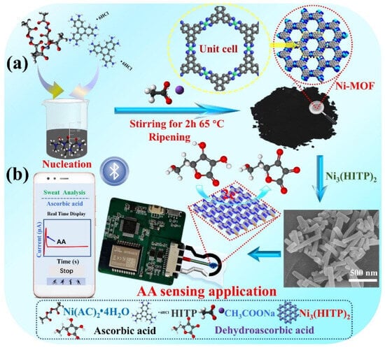 Previously, Ni-MOF-based materials have been extensively used in various electrochemical sensing applications. In this connection, Wang et al. [41] reported the preparation of a Ni-MOF (Ni3(2, 3, 6, 7, 10, 11-hexaiminotriphenylene)2 (Ni3(HITP)2)). Figure 1a shows the structure of Ni3(HITP)2 and its role in the fabrication of the sensor (Figure 1b).