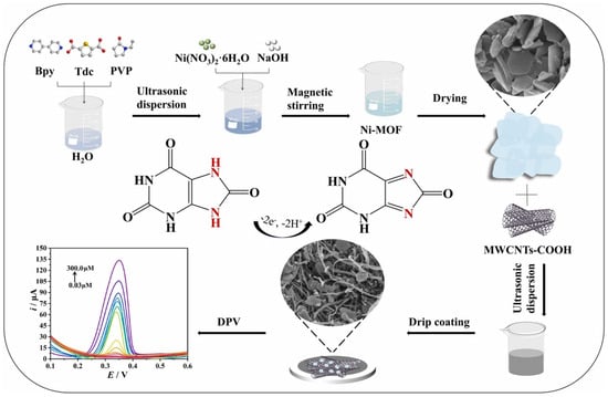 In a recent study [51], Ni-MOF was prepared using the hydrothermal method and modified with reduced graphene oxide (rGO). The presence of rGO may enhance the electrical conductivity of the Ni-MOF/rGO composite. In addition, the presence of synergistic interactions such as high surface area and improved electrochemically active sites facilitated the redox reactions for the determination of epinephrine (EP) and folic acid (FA). This Ni-MOF/rGO-modified GCE delivered a LOD of 0.018 and 0.016 µM for EP and FA detection, respectively. Human serum- and urine sample-based studies revealed the recovery of acceptable amounts of EP and FA, indicating its potential for large-scale applications. The incorporation of Ni-MOF with multi-walled carbon nanotubes (MWCNTs) may be promising strategy. In this regard, Ni-MOF/MWCNT was explored as a sensing layer for the detection of glutamate using the amperometry (Amp.) method [52]. This proposed glutamate sensor was capable of determining glutamate with a LOD of 69.9 μM and sensitivity of 2.90 × 102 μA mM−1 cm−2. 4-Chlorphenol (4-CP) is one of the environmental pollutants that needs significant attention. The detection of 4-CP is of particular significance. Therefore, a Ni-BDC (BDC: 1, 4-dicarboxybenzene)-MOF was incorporated with MWCNTs for the determination of 4-CP [53]. A detection limit of 16.5 nM and LR of 50 to 500 µM with strong stability and excellent selectivity were obtained for 4-CP detection. A uric acid (UA) sensor was also fabricated by employing Ni-MOF/MWCNTs-COOH-modified GCE [54]. The preparation of Ni-MOF/MWCNTs-COOH and its application in UA sensing is illustrated in Figure 2. The MWCNTs-COOH reduced the accumulation of Ni-MOF, which improved the active sites and surface area of the Ni-MOF/MWCNTs-COOH. The Ni-MOF/MWCNTs-COOH modified electrode-based UA sensing exhibited a LOD of 0.005 μM with sensitivity of 6.377 µA µM−1.