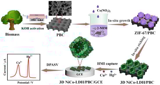 Schematic of the fabrication of 3D NiCo-LDH/PBC/GCE for Cu2+ and Hg2+ detection. Reprinted with permission from Ref. [64]. 2024, Elsevier.
