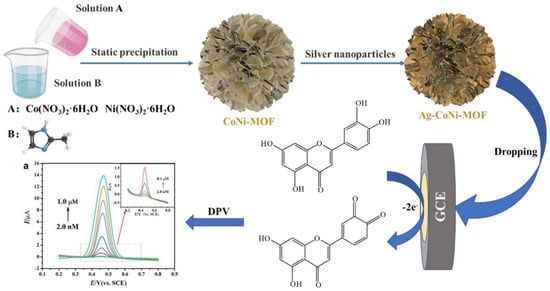 Schematic representation of the fabrication of the Ag-doped CoNi-MOF-based luteolin sensor. Reprinted with permission from Ref. [77]. 2022, Elsevier.