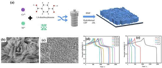 - Sun, X.; Chen, J.; Kong, W.; Yu, Q.; Hu, C.; Long, Y.; Dai, Y.; Gong, J.; Pu, L.; Zhang, H.; et al. Cr-doped Ni-MOF nanosheet array structure anchored on nickel foam with specific orientation for high performance supercapacitors. Electrochim. Acta 2023, 469, 143264. [Google Scholar] [CrossRef]