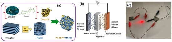 In another report [118], it was believed that MXene may be promising supporting material with which to enhance the electrochemical energy storage properties of MOFs. In this regard, 3D Ni-MOFs@2D MXene (titanium carbide; Ti3C2Tx) was developed for supercapacitor applications. The optimized electrode material (Ni-MOF@MX2) shows a specific capacitance of 1160.5 F/g and 736 F/g at 1 A/g and 20 A/g, respectively. In contrast, a bare Ni-MOF-based electrode exhibits a low specific capacitance of 320 F/g at 20 A/g. This reveals that the introduction of MXene enhances the electrochemical properties of the Ni-MOF. The presence of synergistic interactions also enhanced the stability for 1000 cycles at 20 A/g. The Ni-MOF/MXene composite was also formed through solvothermal synthesis-assisted method (Figure 8a) and used for supercapacitor application [119]. Authors have observed that a prepared composite exhibits abundant redox sites and improved electronic conductivity. The specific capacitance of 716.19 F/g was achieved at 1 A/g under optimized conditions. Furthermore, a Ni-MOF/MXene//AC asymmetric supercapacitor device was also fabricated, and its device structure is displayed in Figure 8b. The fabricated Ni-MOF/MXene//AC asymmetric supercapacitor device was able to light an LED, as shown in Figure 8c. This work explored the potential of the Ni-MOF/MXene composite for the development of asymmetric supercapacitors.