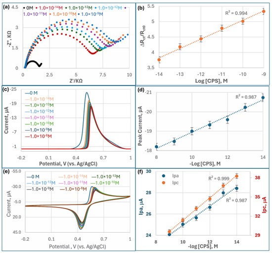 Comparing the three techniques, DPV seems to be the optimal choice for quantitative CPS detection due to its unmatched detection limit (10−17 M), wide linear range, and resistance to non-Faradaic interference. CV provides mechanistic insights but suffers from higher signal variability, while EIS is limited by saturation at high concentrations. EIS measurement is typically slower than DPV and CV, which is another characteristic to be considered. However, by using normalized charge-transfer resistance , EIS may reduce the variations in sensitivity between different biosensors raised from electrode fabrication inconsistencies.