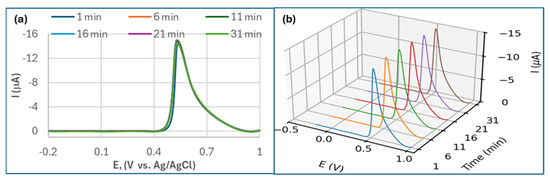 Repeated DPV scan of MQD-AChE biosensor in the presence of 1 × 10−9 M of CPS concentration at 1, 6, 11, 16, 21, and 31 min. (a) is the overlay view and (b) is the 3D view.