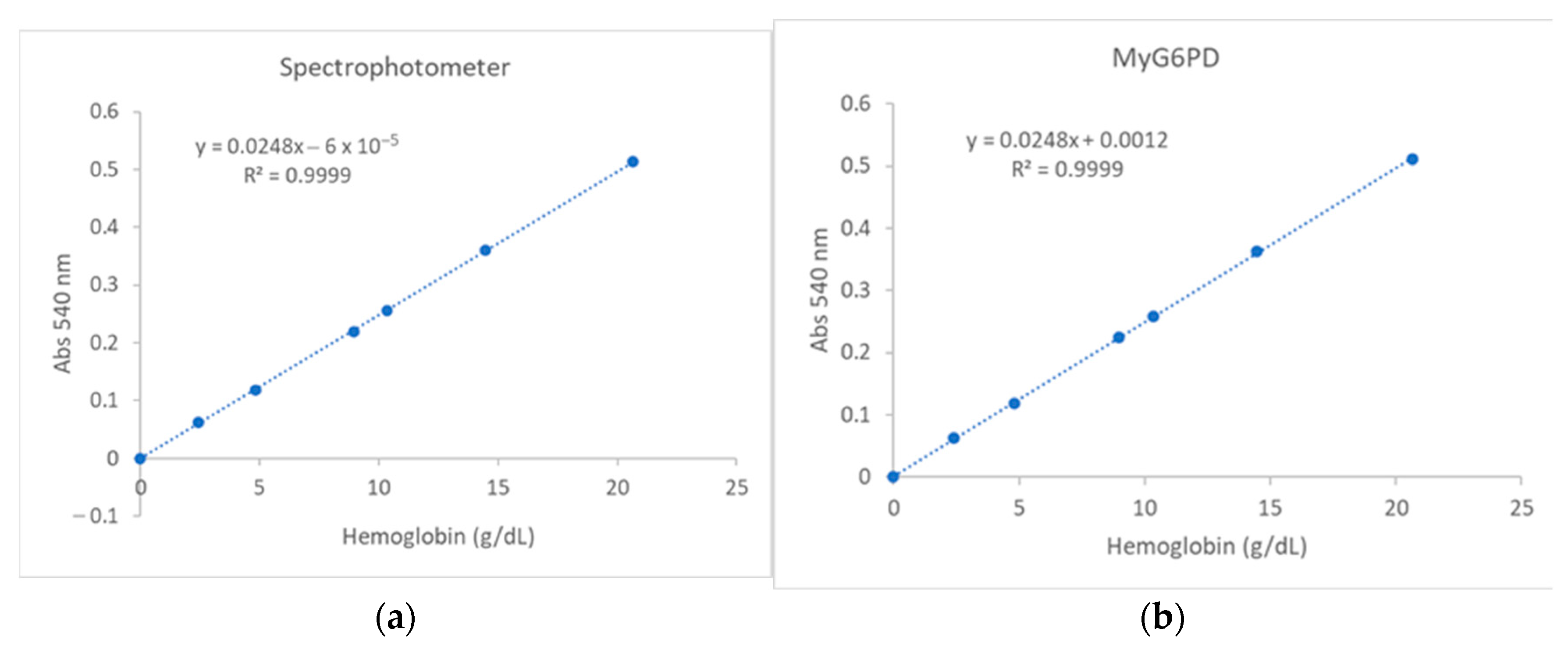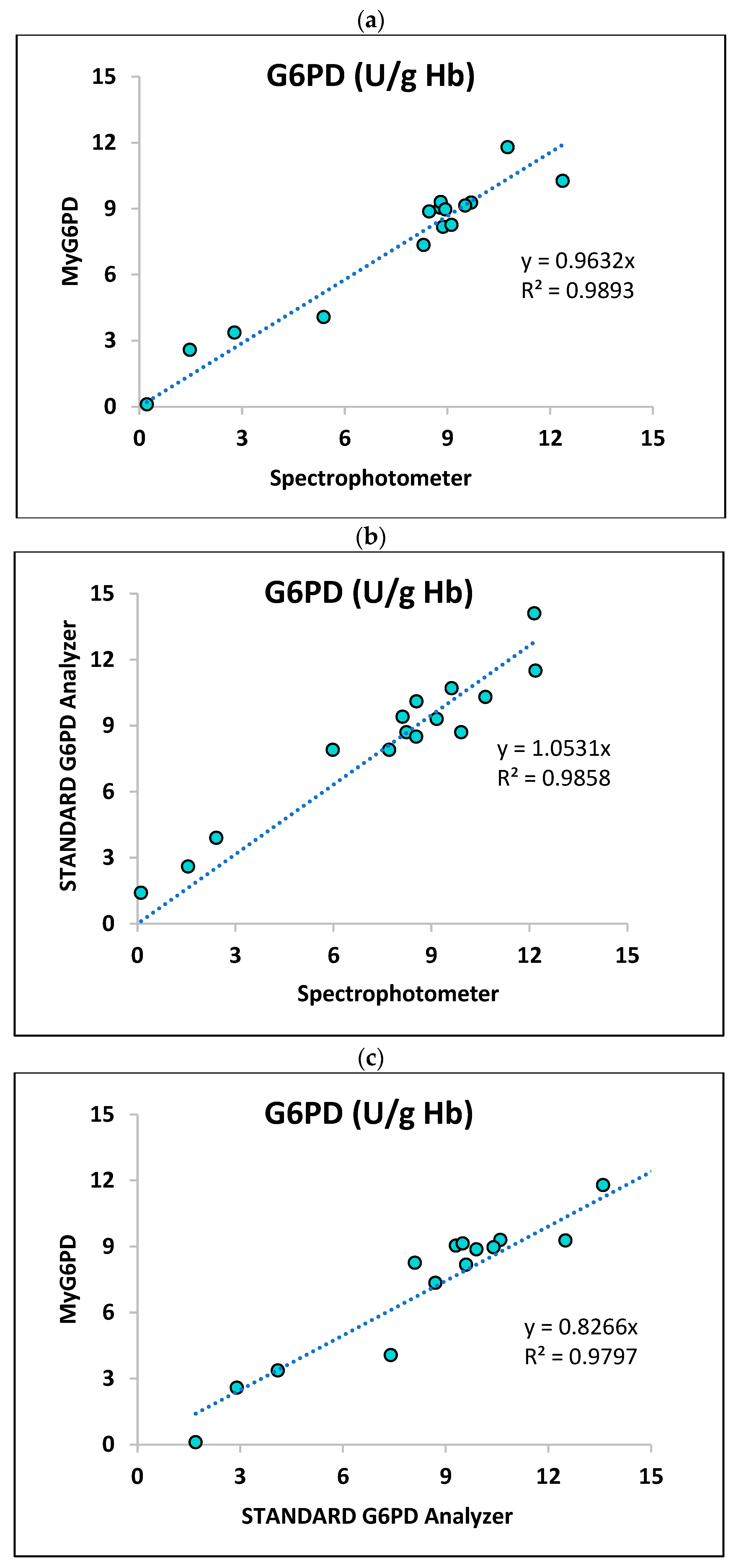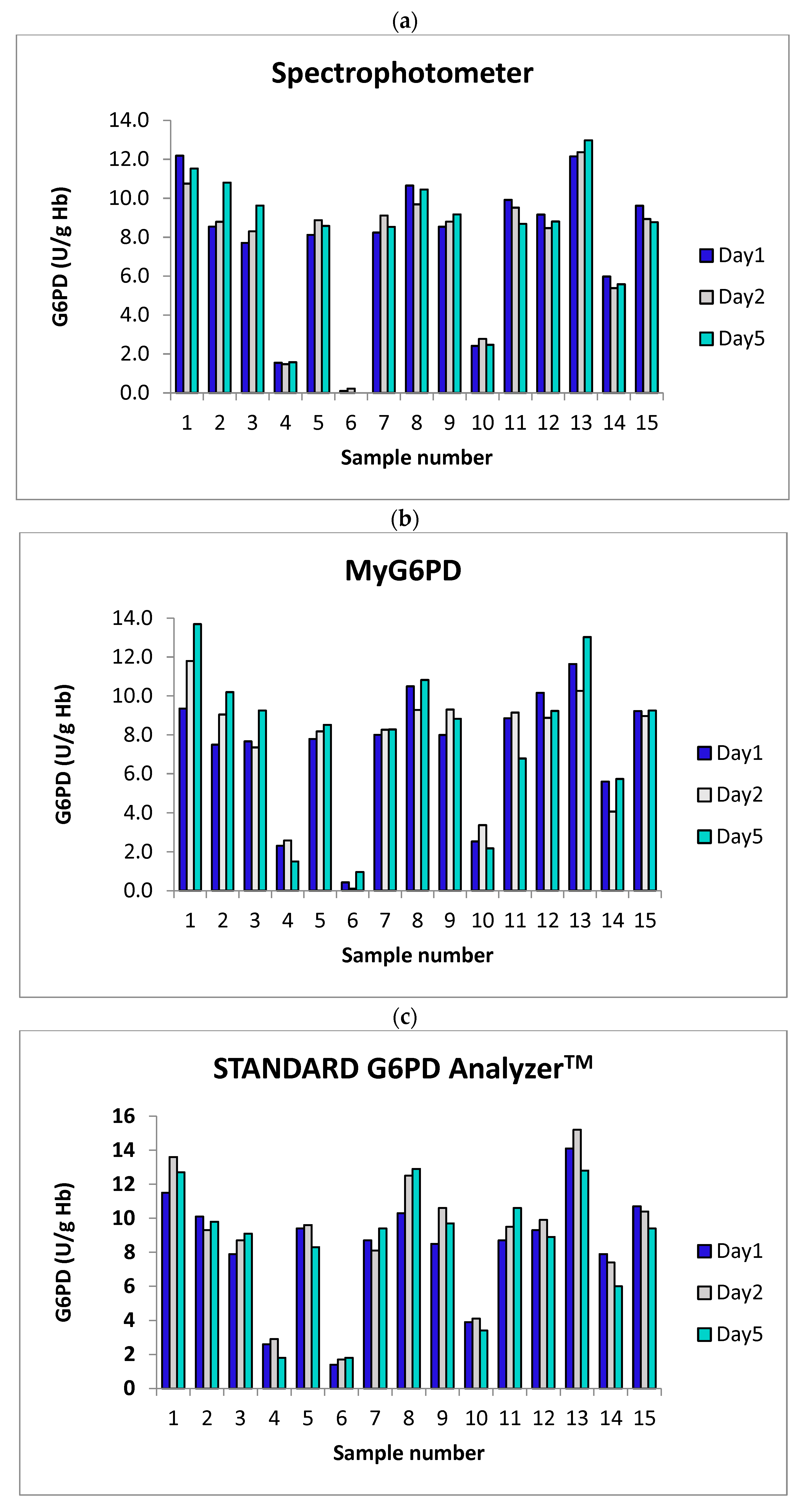 - Pal, S.; Myburgh, J.; Bansil, P.; Hann, A.; Robertson, L.; Gerth-Guyette, E.; Ambler, G.; Bizilj, G.; Kahn, M.; Zobrist, S.; et al. Reference and point-of-care testing for G6PD deficiency: Blood disorder interference, contrived specimens, and fingerstick equivalence and precision. PLoS ONE 2021, 16, e0257560. [Google Scholar] [CrossRef] [PubMed]