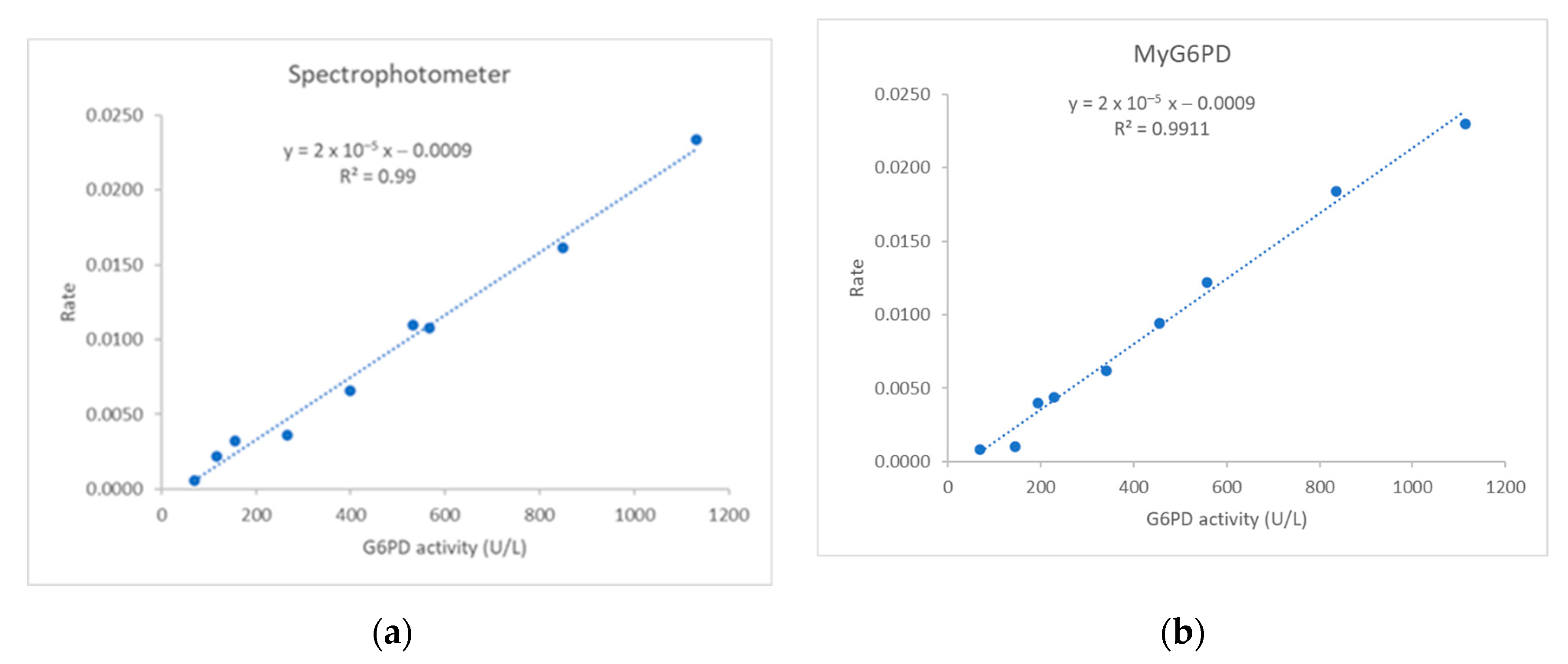 - Bancone, G.; Gornsawun, G.; Chu, C.S.; Porn, P.; Pal, S.; Bansil, P.; Domingo, G.J.; Nosten, F. Validation of the quantitative point-of-care CareStart biosensor for assessment of G6PD activity in venous blood. PLoS ONE 2018, 13, e0196716. [Google Scholar] [CrossRef] [PubMed]