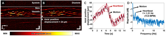 Figure 1A,B demonstrate the PA B-mode images of the finger during the systole and diastole phases, respectively. Skin and vessel layers can be clearly visualized. Figure 1C,D show the blood vessels’ position displacement over time and the corresponding frequency spectrum, respectively. The subject’s heart rate can be clearly captured and represented in the frequency spectrum. It should be noticed that the heart-rate waveform was extracted explicitly from a desired region of interest, which demonstrates the potential for precise local hemodynamic monitoring. These findings demonstrate that high-resolution functional PAM can be a valuable tool in assessing vascular dynamics during peripheral vascular examinations, with the potential to measure parameters such as heart rate, oxygen saturation, and blood perfusion.