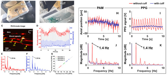 Acquisition of Pulsatile Signals from PAM B-mode Imaging and PPG (reproduced with permission from Ref. [34]). (A) A customized ring-shaped transducer. (B) PPG PCB aligned with the scanning probe. RUT, ring-shaped US transducer; OW, optical window; PBM, parabolic mirror; and PCB, printed circuit board. (C) Cross-sectional PA B-mode image of a human finger, highlighting five blood vessels (yellow arrows) tracked for averaged movement quantification. (D) Time-dependent vascular displacement (PAM) and PPG signal variations. (E,F) Frequency spectra of the PA and PPG waveforms in (D), respectively, both showing a dominant peak at 1.35 Hz. (G) Heart rate comparison between vascular movement (PAM) and blood volume changes (PPG) across three healthy volunteers (three trials each). (H,I) Vascular dynamics (PAM) and PPG signals under normal and brachial cuff-induced conditions. (J,K) Corresponding frequency responses of (H,I).
