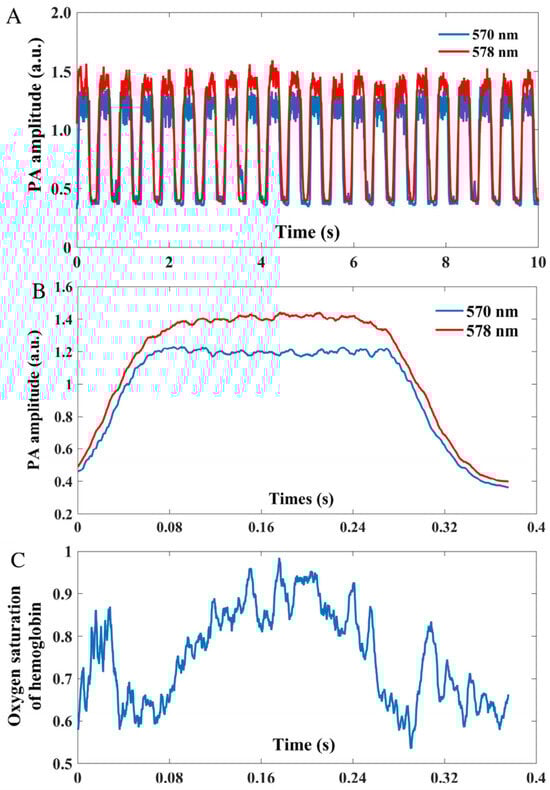 Dynamic PAM amplitude and sO2 variations in a selected artery of the cortical vasculature in a cat (re-produced with permission from Ref. [35]). (A) PA signal amplitude of the artery at 570 nm and 578 nm acquired over 10 s duration. (B) Averaged PA amplitude at 570 nm and 578 nm, with signal alignment performed at amplitude valleys. (C) Pulsatile sO2 measurements across successive cardiac cycles.