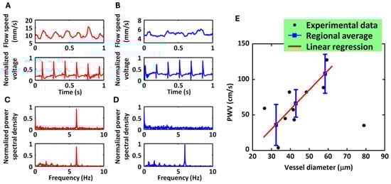 PAM-based quantification of hemodynamic responses in arteries and veins in response to cardiac pulsation (re-produced with permission from Ref. [39]). (A) Arterial flow velocity (top) and synchronized ECG (bottom). (B) Venous flow velocity (top) and synchronized ECG (bottom). (C) Normalized power spectra of arterial flow (top) and ECG (bottom) from (A). (D) Normalized power spectra of venous flow (top) and ECG (bottom) from (B). (E) Pulse wave velocity (PWV) as a function of vessel diameter across ten vascular segments.