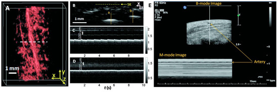 The team conducted scans on a palm region near the wrist where a prominent artery at 1 mm deep was used to investigate pulsatile dynamics as shown in Figure 6A. The 3D image was first captured and then the scanning probe was affixed to conduct a real-time B-scan lasting 10 s (see Figure 6B). Due to the strong light absorption of hemoglobin at 570 nm, the lower portion of the artery was less visible. Nevertheless, the team successfully recorded the motion dynamics of arterial pulsation. An M-mode image through the artery’s center is displayed in Figure 6C. The estimated pulsatile rate from this image was 66 beats per minute, consistent with the 65 ± 2 beats per minute measured by a pulse oximeter. For comparison, an M-mode image of a vein was shown in Figure 6D, which disclosed relatively weak motion in the vein, presumably induced by skin movement caused by arterial pulsation. The team also noted that in the ultrasound image (Figure 6E), the M-mode image revealed that the artery predominantly expanded in a direction perpendicular to the skin surface, with only minimal expansion observed parallel to the skin surface. Although both PA and US M modes can detect pulsatile activity, the waveform origins differ. Pulsatile signals from PA M mode included both arterial position vibration and optical absorption, while those of US M mode were only induced by tissue movement from the same region.