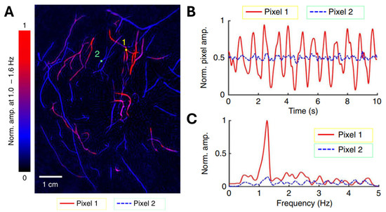 Using SBH-PACT in 2D mode with a 10 Hz frame rate, the team continuously monitored the pulsatile deformation of arteries inside the breast by fixing the transducer array at a specific elevation. After that, the PA signals were analyzed pixel by pixel in the frequency domain to distinguish arteries and veins based on the heartbeat frequency. As shown in Figure 7A, the authors chose a single pixel from an artery and another from a vein, denoted by circular markers 1 and 2, respectively. They then quantified the variation in pixel values as shown in Figure 7B. The consistent cyclic patterns observed in the artery pixel values suggest that these changes can be attributed to the propagation of pulse waves within the arterial network. In contrast, those vessels without pixel value variation belong to the venous network. Moreover, the frequency of these oscillations, as depicted in Figure 7C, agrees with the subject’s heart rate at approximately 1.2 Hz. Leveraging the high spatial and temporal resolutions, a depth-resolved pulsatile mapping from the scanning region can be derived to identify arteries and veins, respectively. The uniqueness of this PA imaging technique enables vessel category differentiation at a specific depth.
