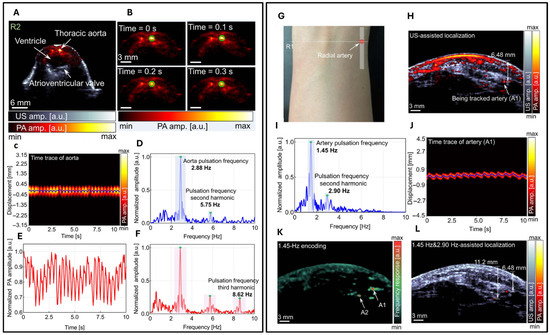 The authors initially validated the system by imaging mice. In Figure 8A, co-registered US and PA images are presented for a cross-sectional slice near the heart. Representative PA images throughout one heartbeat cycle are illustrated in Figure 8B. The variations in signal position, as captured in Figure 8C, are represented by the vertical line in Figure 8A, accompanied by a Fourier analysis illustrated in Figure 8D. Furthermore, the author identified a distinct, rhythmic pulsation in the amplitude of the aorta, as demonstrated in Figure 8E, with its corresponding Fourier analysis presented in Figure 8F. These variations are synchronized with the heartbeat and thus serve as indicators of cardiovascular dynamics. The frequency of both displacement and amplitude associated with the heartbeat was measured at 2.88 Hz, demonstrating consistent alignment between the two parameters. The system’s high sensitivity also allowed the detection of the second (5.75 Hz) and third harmonics (8.62 Hz) of the heartbeat. The result indicates that with high imaging speed, a precise pulsatile waveform can be captured, therefore revealing more hemodynamic features. Subsequently, the authors applied the same system to image the human forearm. A continuous monitoring of a cross-sectional forearm area is illustrated in Figure 8G. Using dual-modal imaging, the radial arteries were successfully located, as displayed in Figure 8H. The authors recorded changes in arterial position, represented by the white solid line in Figure 8I, and determined the fundamental and harmonic frequencies of the major radial artery through Fourier transformation. Furthermore, an analysis of the temporal frequency of each pixel in the PA images allowed for the encoding of blood vessels with pseudo-color, as demonstrated in Figure 8K. Two specific locations exhibiting strong pulsations were identified and marked in Figure 8K and highlighted in the combined ultrasound and PA image overlay, as shown in Figure 8L. The quantitative in vivo results demonstrate significant potential for advancing cardiovascular-related applications. These findings suggest that the technology could enhance the diagnosis, monitoring, and treatment of cardiovascular conditions by providing more accurate and detailed insights into blood flow dynamics, and vascular health.