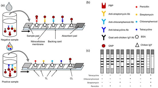 The immunochromatographic test strip was designed as shown in Figure 1. The application of BSA-ampicilline, BSA-streptomycin, BSA-chloramphenicol, BSA-tetracycline, and chicken IgY to the nitrocellulose resulted in the formation of four TLs and a control line (CL), respectively. To the lyophilized GNP conjugates, 200 µL of an untreated (undiluted and without additives) milk sample was added. The well was then incubated for 5 min at 40 °C in a thermo-incubator (Allsheng, Hangzhou, China). Following the incubation period, the test strip was immersed into the well for a duration of 5 min. After incubation, the test strip was placed in the well for 5 min, allowing the mixture to migrate along the strip by capillary action. Subsequently, the test strip was removed from the solution and the sample pad membrane was detached to stop the liquid flow. In the absence of analytes in the sample (Figure 1a), receptors bind to antibiotics bound to BSA. This binding leads to the accumulation of GNPs on the TL and the subsequent appearance of coloration. Analytes present in the sample inhibit the GNP conjugate binding to the protein–hapten conjugate on the TL, causing weak or absent TL coloration (Figure 1b). The test result is determined by comparing the intensity of the TL and CL (Figure 1c). In cases where the TL is more intense than the CL, the result is negative. In cases where the TL is found to be less intense than the CL, or where these two variables are found to have comparable intensity levels, the result is deemed to be positive. The visual limit of detection (vLOD) was defined as the lowest analyte concentration at which the intensity of the TL was comparable to or lower than that of the CL, as determined by visual inspection.