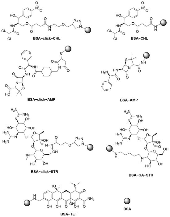 Therefore, for the optimization stage, the BSA-click-AMP, BSA-click-STR, BSA-CHL, and BSA-TET conjugates were selected. The structures of the resulting conjugates are illustrated in Figure 3.