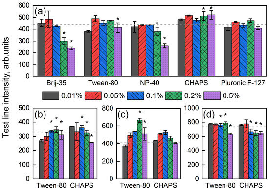 We hypothesized that adding amphiphilic molecules such as detergents can address the problem (Figure 4). It is believed that the strong affinity of proteins to nitrocellulose arises from dipole interactions between the nitro groups of the polymer and the carbonyl groups in peptide bonds, as well as interactions with hydrophobic amino acid residues of proteins [43]. However, excessive detergent levels may disrupt conjugate–nitrocellulose interactions, leading to conjugate desorption and impaired signal response. The concentration effect of several detergents commonly used in immunoassays was studied for BSA-TET performance evaluation: the nonionic detergents Brij-35, Tween-80, NP-40, and Pluronic F-127, and the ionic detergent CHAPS (Figure 4a).