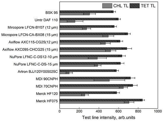 Comparison of test line coloration intensity for BSA-CHL and BSA-TET conjugates applied to different nitrocellulose membranes. Values shown are the means of three runs ().
