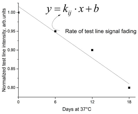 To evaluate the stabilizing effect, an accelerated aging test (AAT) was employed—storage at a temperature exceeding the intended storage temperature. This approach to predicting the shelf life of a product is grounded in the Arrhenius equation and is therefore known as an “Arrhenius accelerated stability study” [47]. The prepared lyophilizates were stored at 37 °C, and the functionality of the conjugates was assessed at various time intervals. To select the optimal formulation for the stability of all gold conjugates, we used the Harrington desirability function, which is well-suited for multiparameter optimization [48].