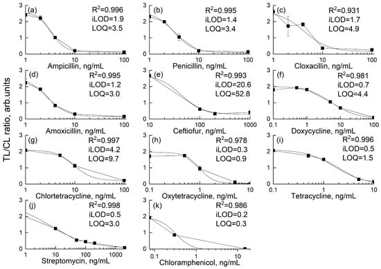 Calibration curves of control-to-test line intensity ratio vs. antibiotic concentration in milk for (a) ampicillin, (b) penicillin G, (c) cloxacillin, (d) amoxicillin, (e) ceftiofur, (f) doxycycline, (g) chlortetracycline, (h) oxytetracycline, (i) tetracycline, (j) streptomycin, and (k) chloramphenicol. Values shown are the means of three runs ().