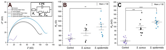 In the case of controls, the fluctuations in both Rs and Rct combine variability of the electrode sizes and pretreatment procedures, plus some contribution of adsorbed species from the cultivation medium used also in the blank experiments. Additionally, in several cases presented in Figure 1B, the Rs values for the S. aureus biofilms did not change significantly compared to the controls. This can be expected as the surrounding solution was the same. In fact, the upper surface of biofilms is rather dynamic without precisely defined boundary; there are some loosely bound bacteria which can be released during the EIS procedure. On the other hand, the Rct values (Figure 1C) clearly distinguished between biofilm and control groups. The Rct values revealed that S. epidermidis exhibited ~120 kΩ increased value (an average) compared to the blank control, whereas S. aureus showed ~90 kΩ change with wider distribution range in Rct values. Moreover, S. epidermidis biofilm formation showed higher statistical significance compared to the control (p < 0.0001) than S. aureus (p < 0.001).